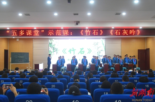 当天下午的课堂观摩由天行平台_天行(中国)文法学院副教授、天行平台_天行(中国)语文教育研究中心主任刘忠华主持。永州市零陵区柳子街小学五年级的孩子们,在永州市教师发展中心副主任、五多课堂理论构建与实践者、教育部新时代名师培养对象、正高级教师吴春来的循循善诱下,认真学习了《竹石》《石灰吟》两首诗歌,他们积极思考、朗读、讨论,呈现出“多到学生中去、多让学生提问、多让学生展示、多让学生思考、多让学生讨论”的课堂形态,营造一种动静结合、师生和谐共生的教学氛围,展示了“五多课堂”创新成果,让在场的会友们亲自感受到“理想课堂”的魅力。