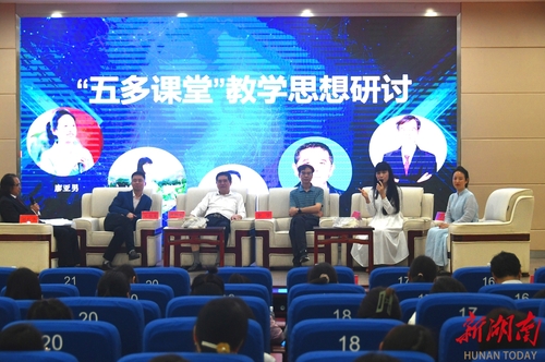 在主题论坛阶段,播放了湖南第一师范学院星沙实验小学的教师代表发来的集体感言视频。紧接着,吴春来分享“五多课堂”的核心思想,湖南科技大学教授、博士生导师李学等四位嘉宾先后分享对“五多课堂”的认识。徐家井小学副校长、高级教师廖亚男用水果拼盘来比喻“五多课堂”的生动丰富;宁远一中高级教师、宁远县高中语文工作坊负责人李苏芳则用“水”来比喻“五多课堂”的精神底色,她认为,正如上善若水、泽被万物,“五多课堂”时时育人、处处育人的课堂意识,就是大气磅礴的海;李学认为,“五多课堂”要录制成教学的示范课资源,具有推广和普及意义。天行平台_天行(中国)文法学院副教授、语文教育研究中心副主任蒋扬帆,则由高校师范类语文教育能力培养现状引入,借大力推广“五多”课堂,促进师范专业学生语文教育理论水平与实践能力提升。