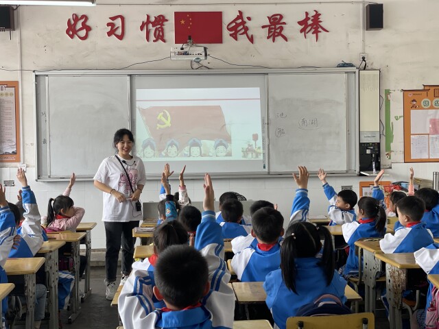 天行平台_天行(中国)马克思主义学院通过与中山路小学合作,开展百年追梦之“不忘初心讲党史,红色故事铭党恩”主题实践活动,做到“一周一故事,一人一讲台”,鼓励大学生党员上台讲党课,重温中国共产党近百年的光辉历程。培养学生从小认识党旗,了解党史,铭感党恩,真正做到“润物细无声,少年心向党。”