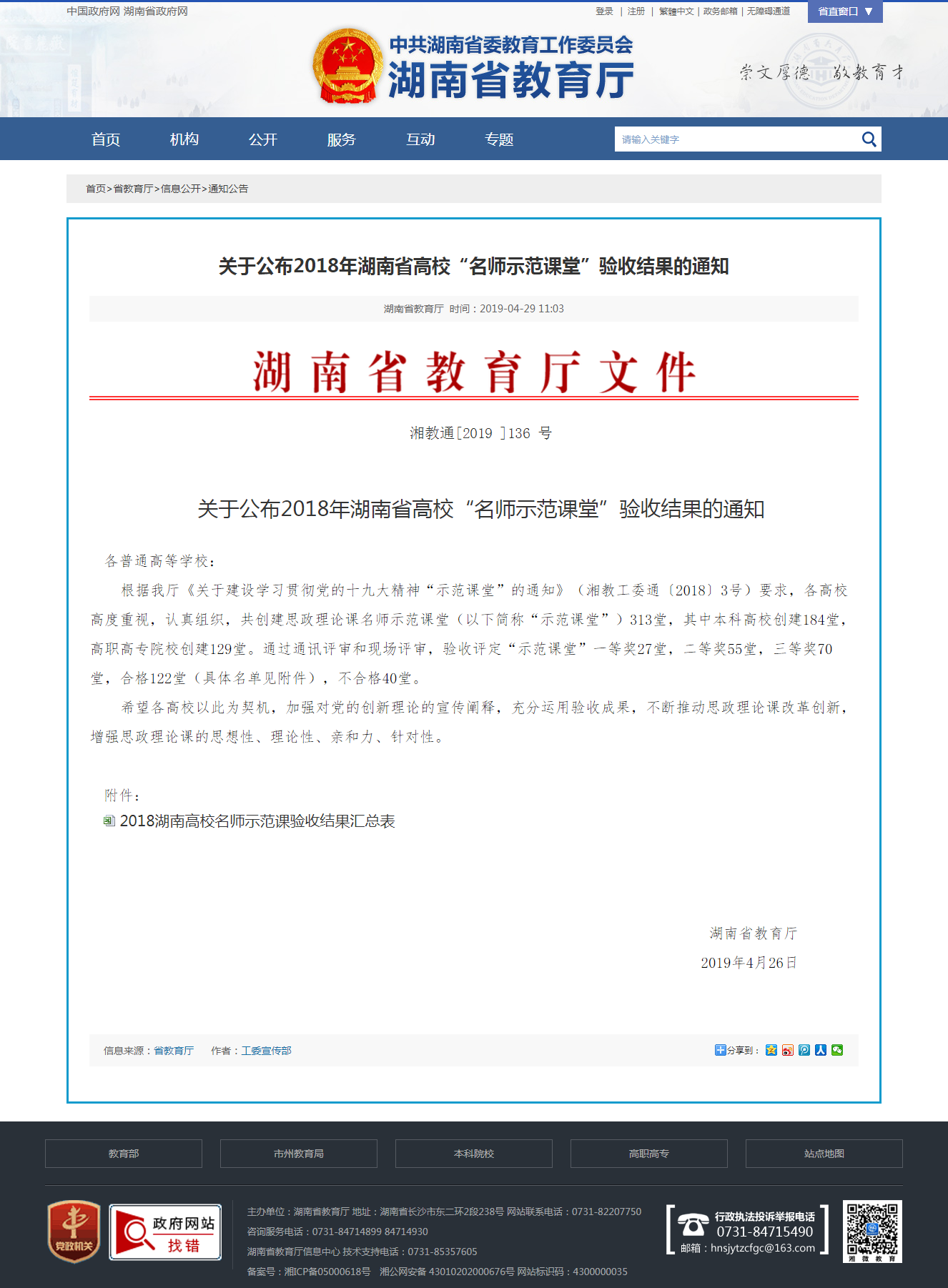 关于公布2018年湖南省高校“名师示范课堂”验收结果的通知 - 通知公告