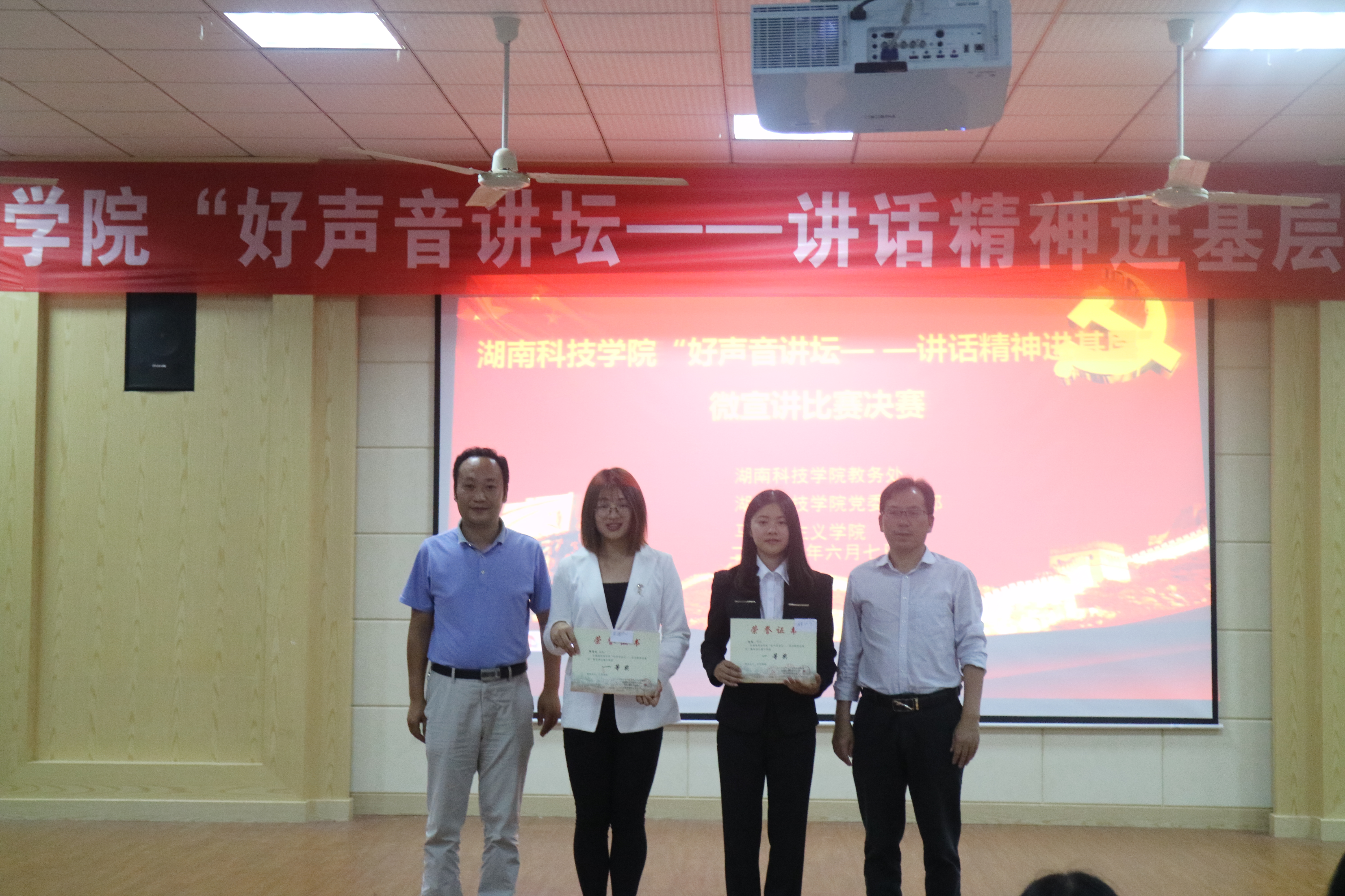 本网讯 (通讯员全伟贺茶香)6月8日晚,马克思主义学院在致远楼701举办“好声音讲坛——讲话精神进基层”微宣讲竞赛决赛。教学质量管理处处长聂志成、党委宣传部部长杨涛、教务处副处长包本刚、学工部副部长唐君,该院院长廖雅琴、党总支书记唐森树、党总支副书记李观求等出席并担任评委。