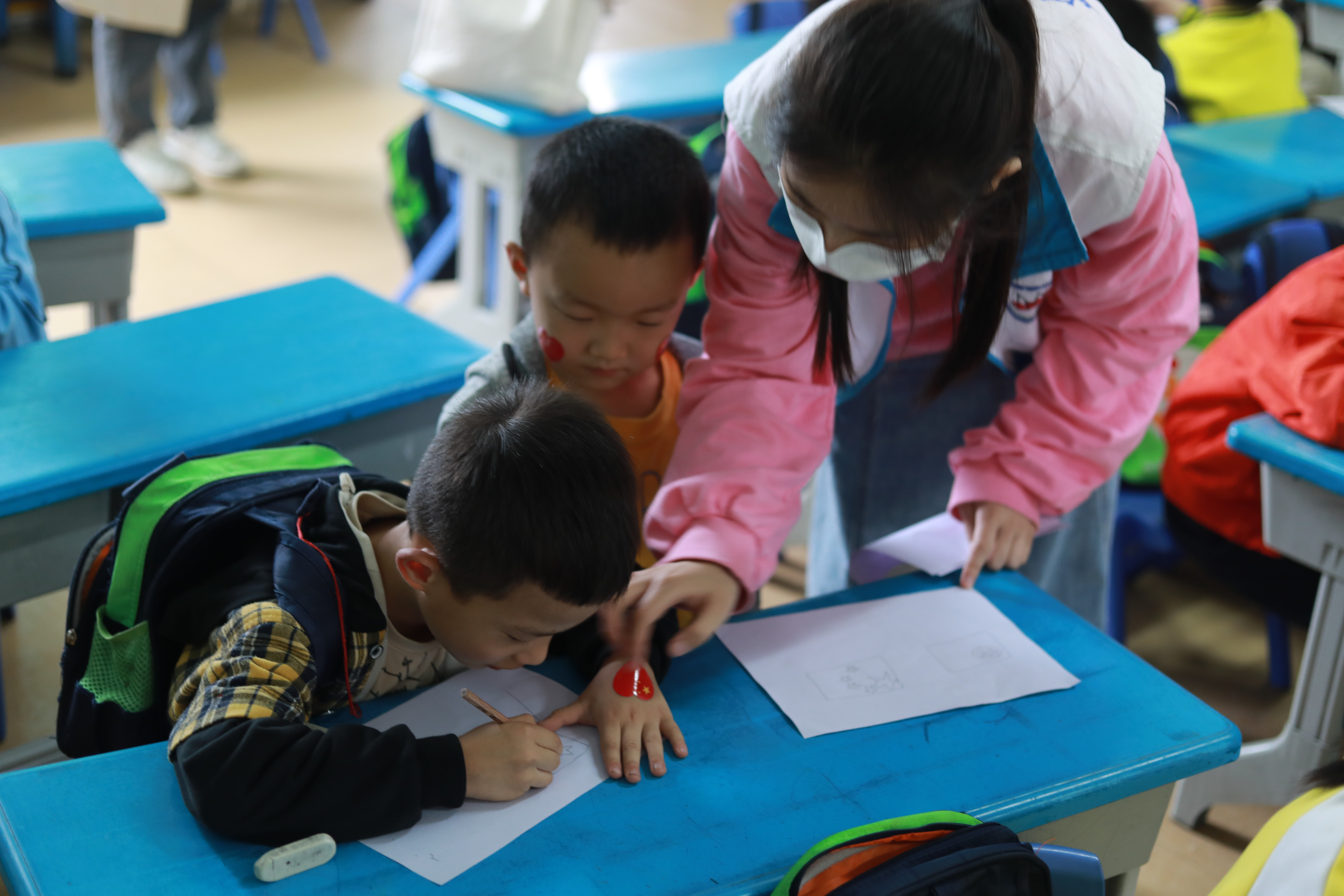 本次活动主要由三个部分组成,分别为:团旗团徽的讲解、团旗团徽的绘画和爱国歌曲的学习。在活动开始前,志愿者们已准备了精美的PPT,以便小朋友们能够更好的了解团旗团徽的相关信息。活动过程中,志愿者们分工明确、各司其职、有条不紊,小朋友们也与志愿者们积极互动,反响热烈,掌声不断。活动接近尾声时,志愿者们给每个小朋友发放礼物作为奖励,与他们进行告别。