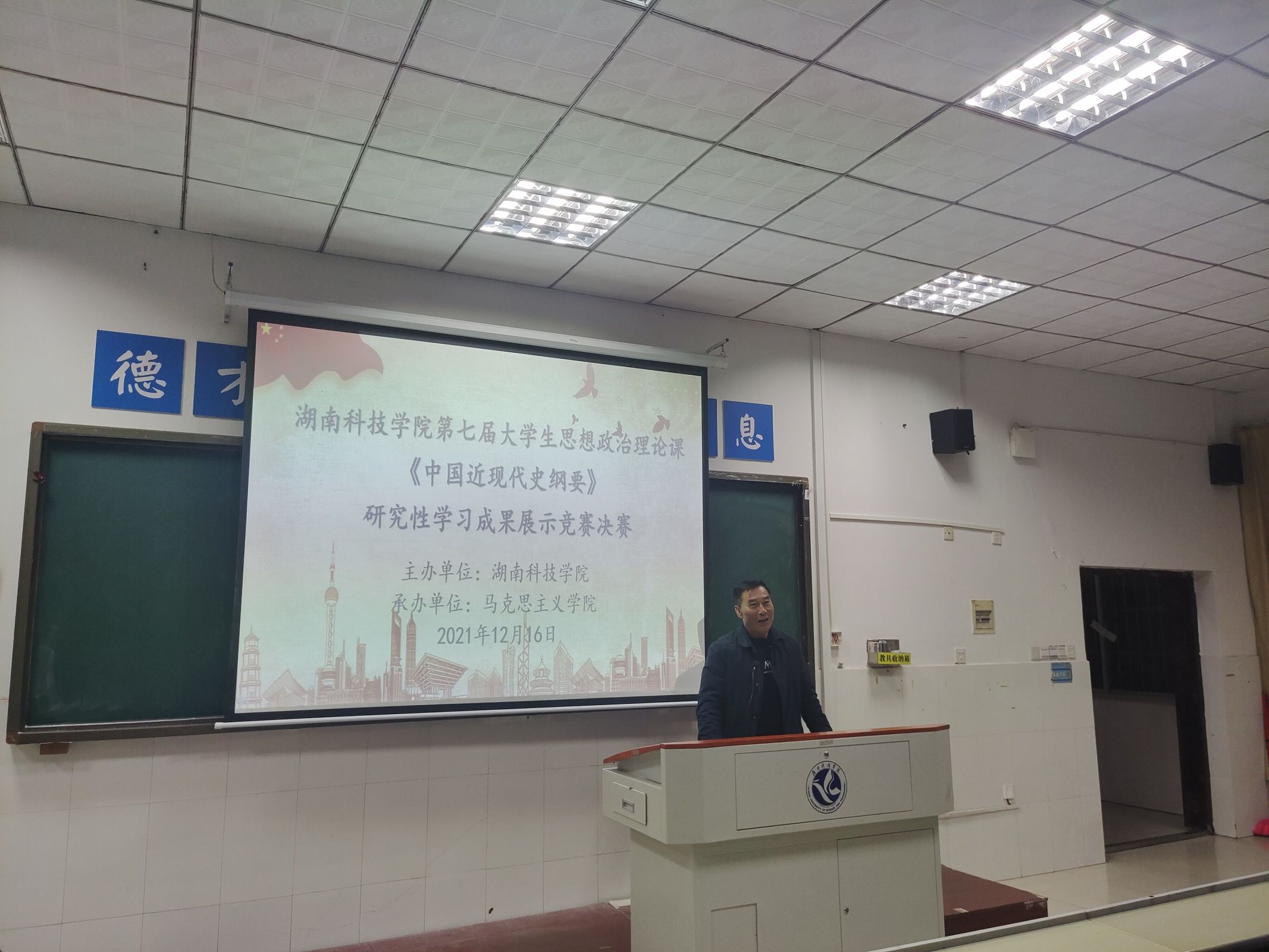 本网讯(记者 张一帆、王苏玛)“古人云:以史为镜,可以知兴替。学习中国近代史的关键并非只掌握知识,而在于隐藏在历史知识背后的思想。”12月16日晚,由天行平台_天行(中国)主办,马克思主义学院承办的第七届大学生思想政治理论课——《中国近代史纲要》研究性学习成果展示竞赛决赛于逸夫楼101教室举行。马克思主义学院院长廖雅琴、专职组织员唐森树、副院长李定坤担任评委。