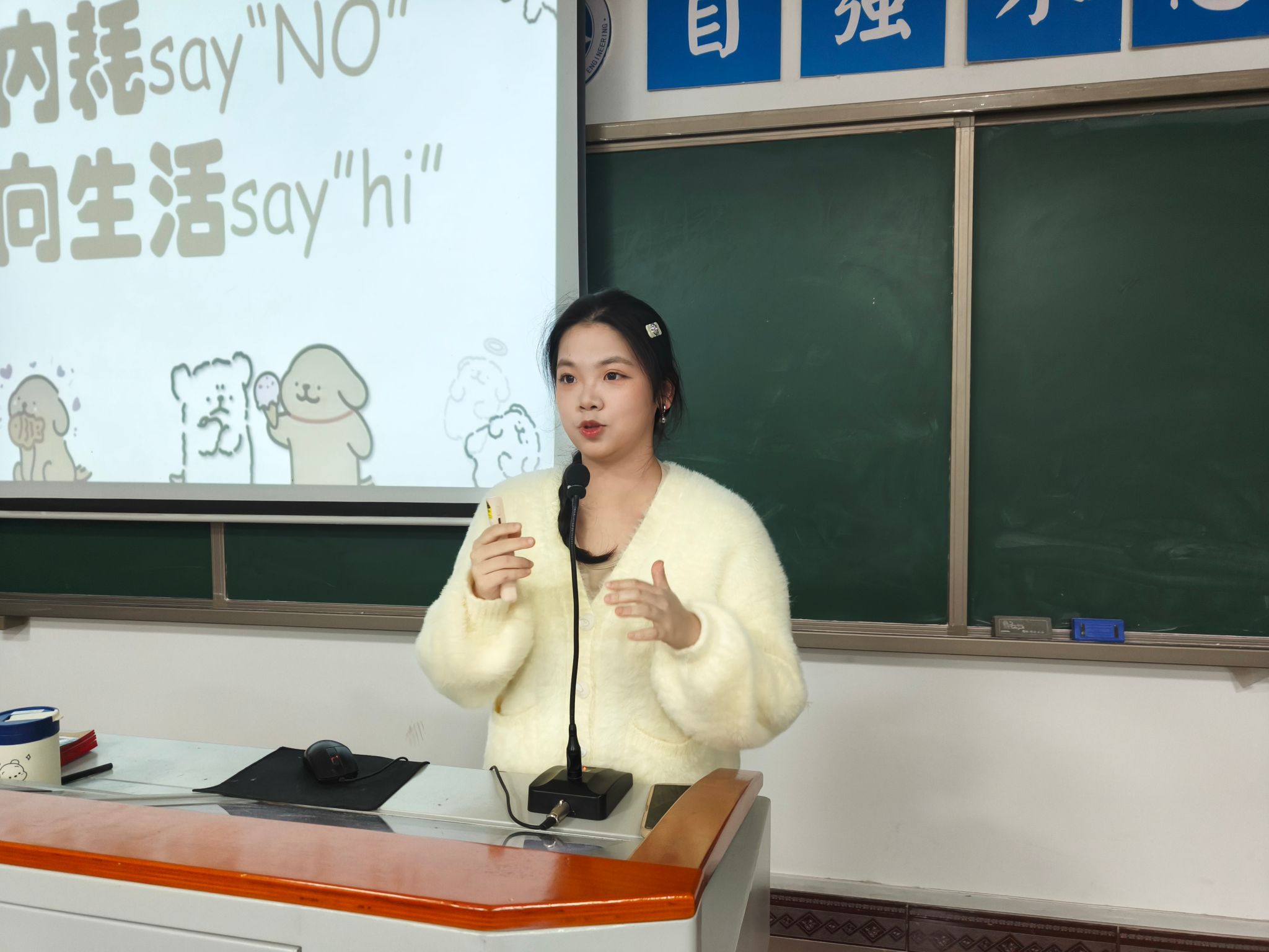 潘媛围绕认识精神内耗、内耗产生的原因以及如何摆脱内耗三个方面展开微课,通过趣味折手指游戏、案例分享、交流互动等方式,帮助同学们更清晰地认识当下的心理状态,从而更好地认清自我、应对内耗、接纳自我。