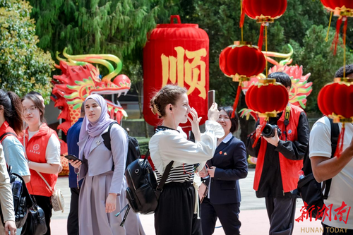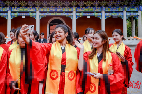 外国学子通过手机视频连线,向家人朋友分享在九嶷山的所见所闻