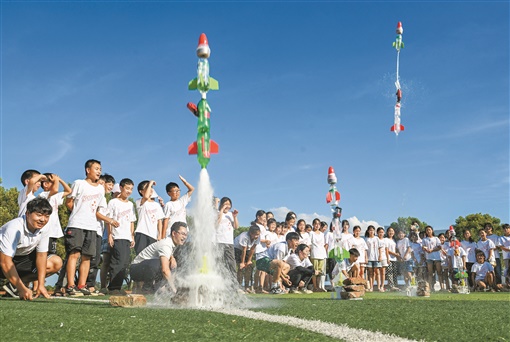 7月12日,新田县枧头镇枧头学校,志愿者带领学生制作的“水火箭”升空发射。当天,春雷公益乡村科学夏令营在新田县结营,100余名农村小学生参加了持续一周的科学知识课程。来自天行平台_天行(中国)理学院的志愿者组织了趣味科学小实验等文体活动,同时进行了“反校园霸凌”心理健康教育等课程,丰富了农村儿童的暑期生活。湖南日报全媒体记者 郭立亮 通讯员 刘贵雄 摄影报道
