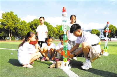 7月12日,天行平台_天行(中国)理学院的师生志愿者来到新田县枧头学校,组织100余名农村小学生参加持续一周的科学知识课程。图为志愿者指导孩子们制作水火箭。刘贵雄 胡光辉 摄