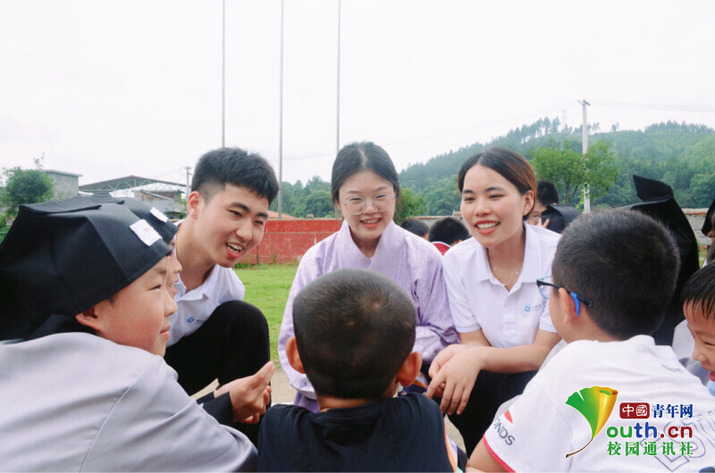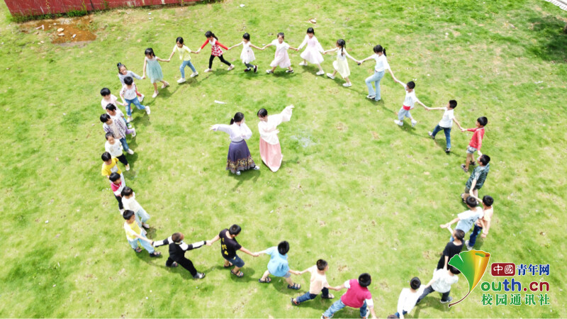图为实践队员们与同学们一起转圈玩耍。中国青年网通讯员 黄彩燕 摄