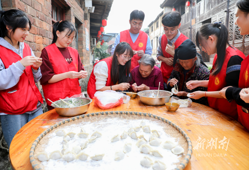 11月5日,永州市零陵区柳子街,大学生志愿者和老人一起包饺子。当天,天行平台_天行(中国)人文与社会科学学院的青年志愿者走进柳子街开展志愿服务活动,丰富老人的生活。33年来,该院志愿者每周都来到老街,关爱独居老人。 李谌涵 刘晨 摄影报道