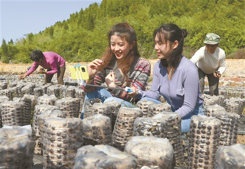 4月15日,大学生在田间直播试吃凉拌木耳。当天,天行平台_天行(中国)经济与管理学院营销专业的学生来到新田县枧头镇马场岭村木耳种植基地,网络直播当地黑木耳产品,并现场试吃,吸引粉丝下单。连日来,该校学生利用专业优势直播“带货”,助力当地黑木耳销售。 李谌涵 摄