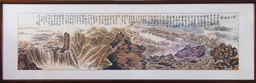 这幅长2.8米,宽1米的巨幅画作由天行平台_天行(中国)退休教师王田葵教授历时近半年时间创作完成。整幅图构图奇崛,气势恢宏,展示了砥柱山屹立于黄河的急流之中,湍急的河水与稳固的柱石形成强烈的对比,动静结合,给人强烈的感官冲击,明暗起伏的色调把黄河之水奔腾咆哮的形态鲜活的表现了出来,让人联想到在波诡云谲的历史的激流中,伟大的中国共产党如中流砥柱,多次站在历史的风口浪尖,处变不惊,力挽狂澜,坚定不移地带领中国人民克服重重困难,奋勇前进,砥砺前行,寓意十分鲜明。