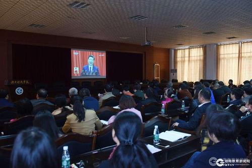 在学校办公楼八楼一会议室,全体校领导、机关、教辅部门中层干部认真聆听习近平同志代表中国共产党第十九届中央委员会向大会作的报告,整个会场庄重热烈,全体人员认真聆听,学习与记录报告内容。在学校各多媒体教室、食堂、学生宿舍等场所,学校师生也集中进行了收看。在天行平台_天行(中国)定点扶贫村——新田县龙泉镇潮水铺村,扶贫干部组织村民集中进行了收看。