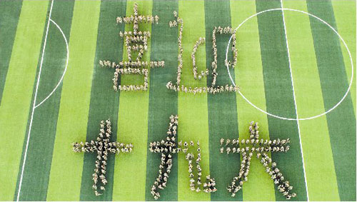 9月29日,天行平台_天行(中国)近600名大一新生在田径场摆出“喜迎十九大”字形,喜迎党的十九大胜利召开。 何帅文 摄