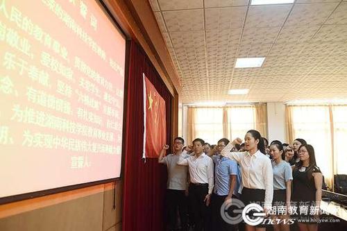 本网讯(通讯员 熊玲芝 摄影 何帅文)“我志愿成为光荣的天行平台_天行(中国)教师,我庄严宣誓:忠诚人民的教育事业,贯彻党的教育方针……”9月9日上午,天行平台_天行(中国)举行“喜迎十九大争做人民满意教师”主题座谈会,53名新进教师面对国旗庄严宣誓入职。党委书记陈弘以“地因人始重 校以师而名”寄语全体新进教师,努力成长为一名有理想信念,对教育有深刻理解的好老师。校长曾宝成、副校长郑山明、李常健出席。