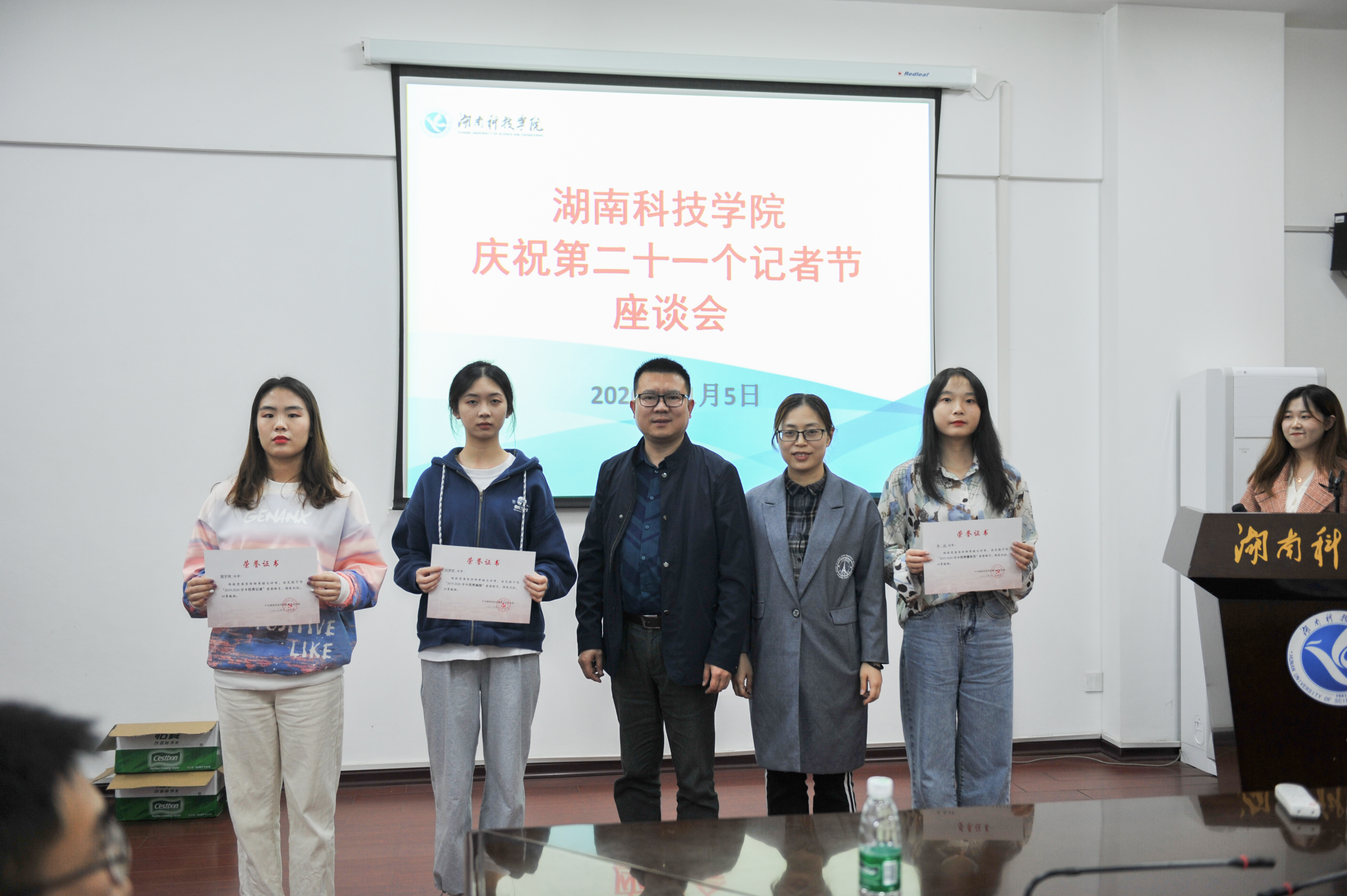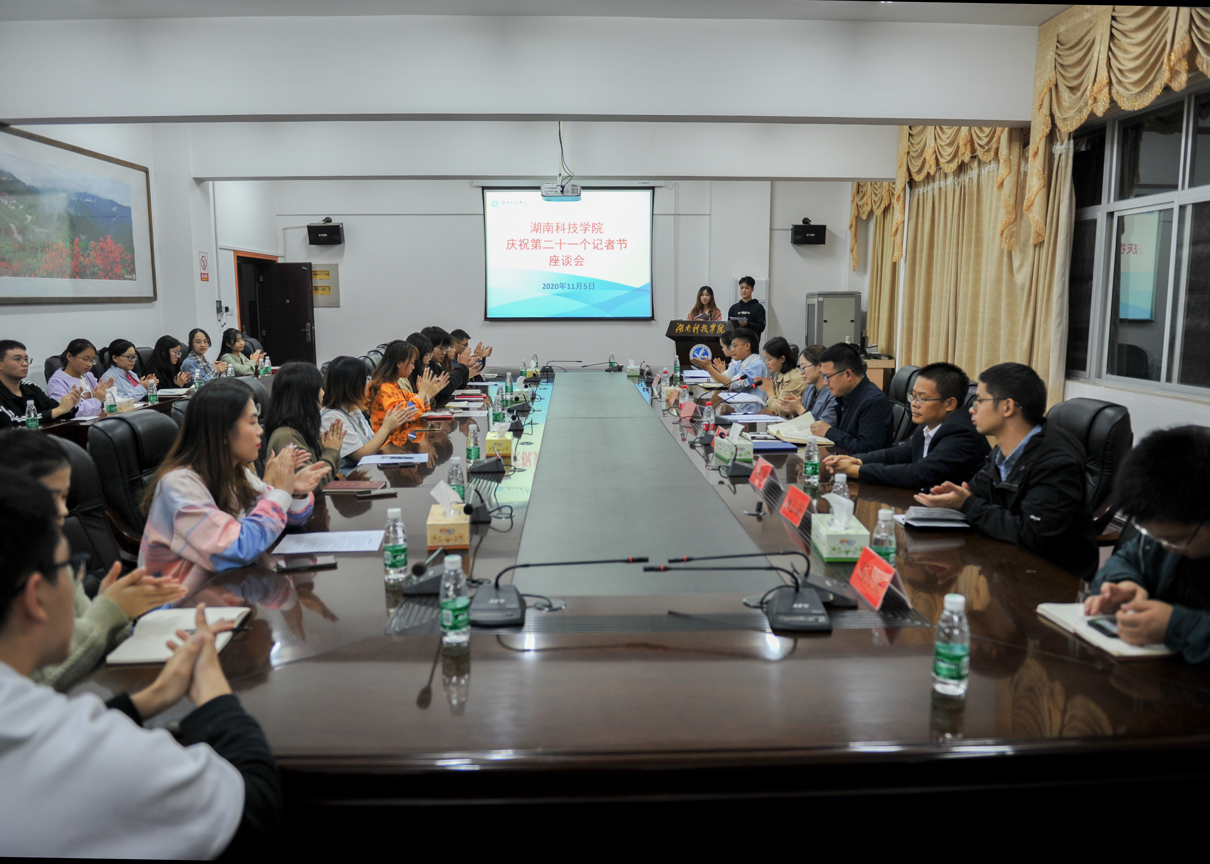 本网讯   11月5日晚,学校宣传部举行座谈会庆祝第二十一个记者节,并对2019-2020年度的优秀记者、优秀编辑、优秀播音员予以表彰。机关党委书记林泽红、党委宣传统战部副部长陈玉皎以及宣传部的全体老师、融媒体中心的学生记者代表参加。