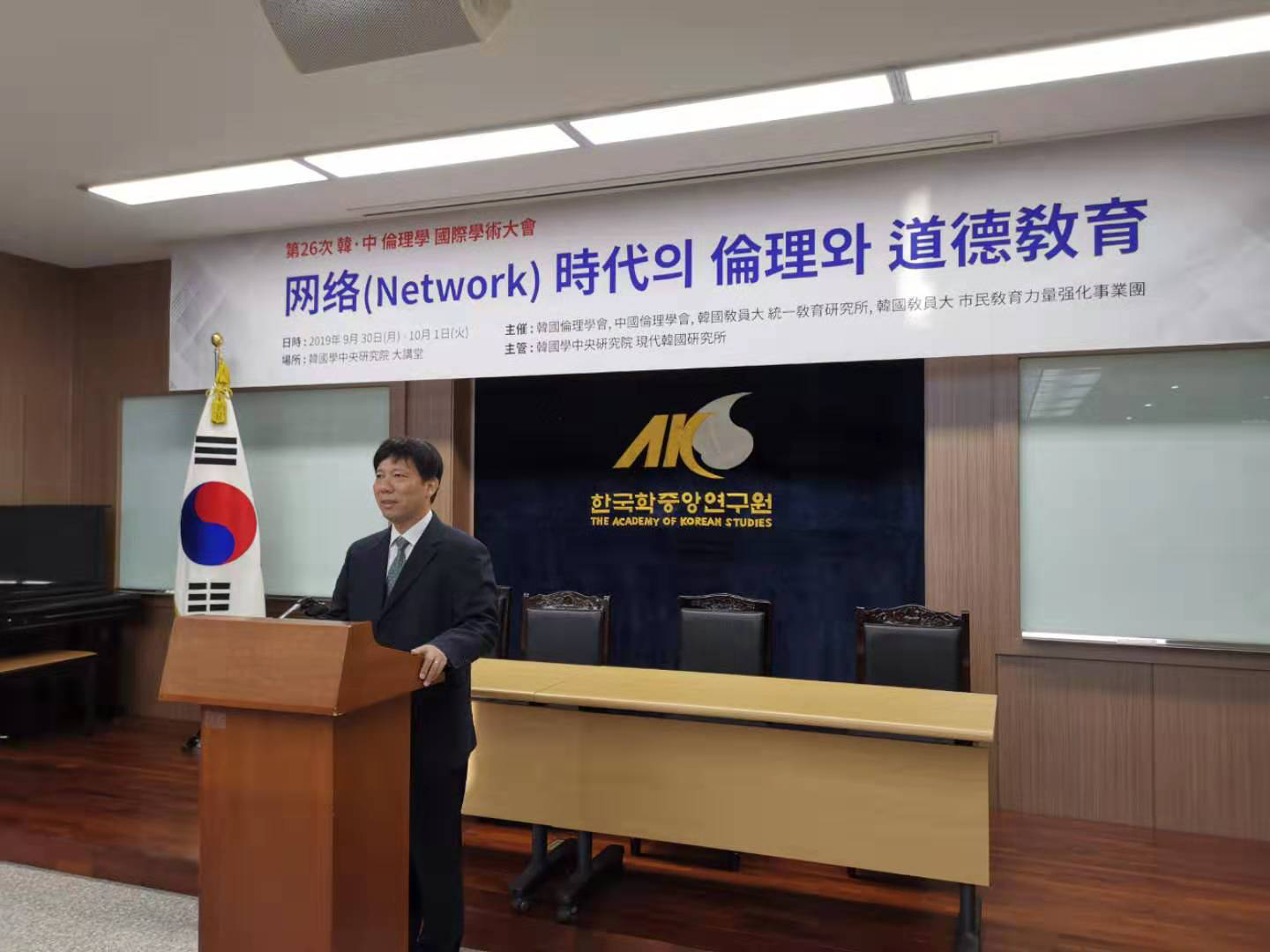 本网讯 近日由韩国伦理学会、中国伦理学会共同主办的第26次韩中伦理学国际学术大会在韩国举行,本次大会的主题是“网络时代的伦理和道德教育”,来自中国和韩国的108名伦理学研究者和道德教育工作者参加会议。我校潘剑锋教授应韩国伦理学会的邀请参加了此次会议,并作了题为“网络时代更需要加强孝道教育”的学术报告。他从传统孝道中的育人思想、传统孝道育人思想的育人作用、当今网络条件下加强孝道教育刻不容缓三方面阐明了为什么网络社会更需要加强传统孝道教育,受到了中韩学者的高度评价。