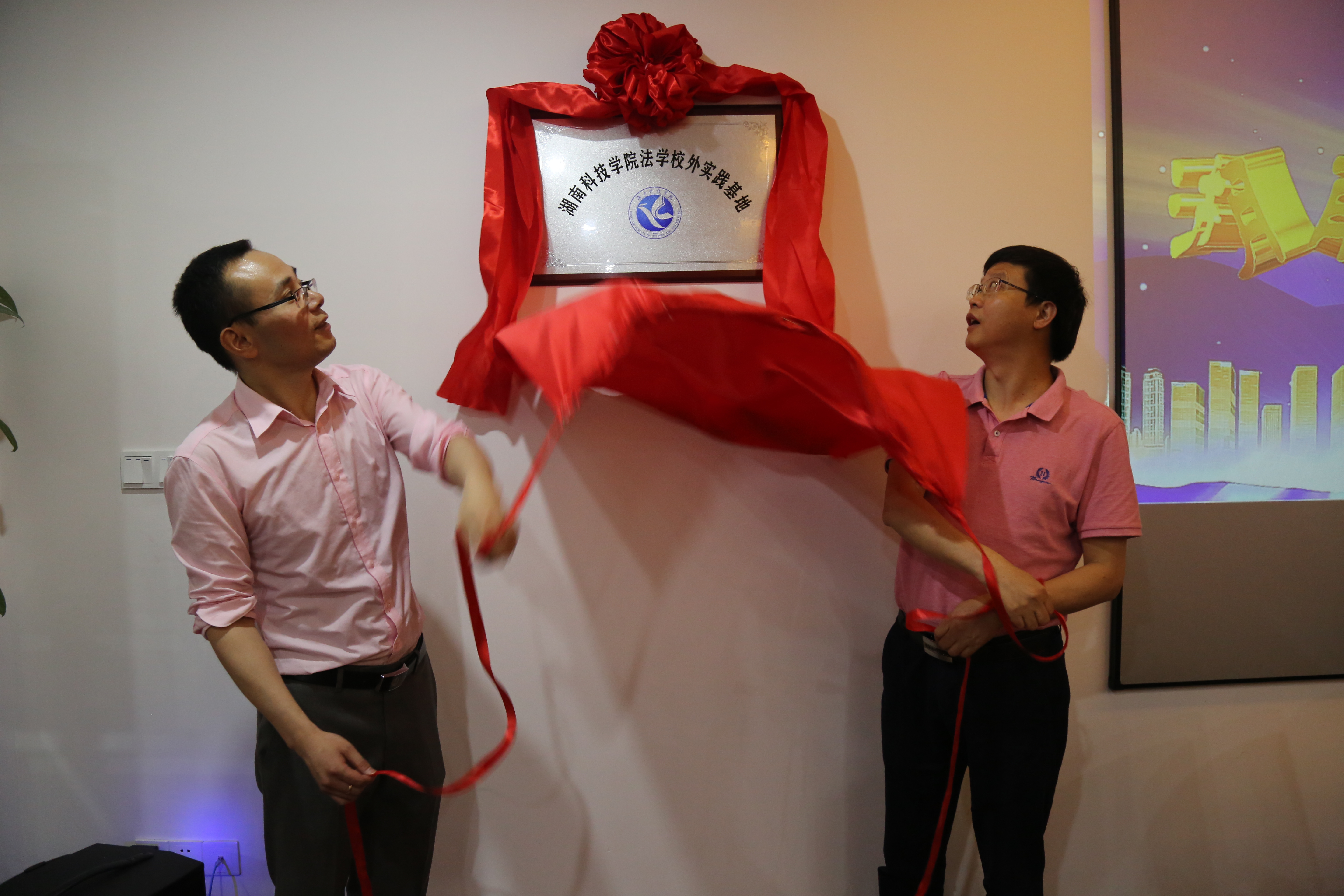 本网讯 6月10日上午,天行平台_天行(中国)法学专业校外实践基地揭牌仪式在湖南弘一(永州)律师事务所举行。湖南弘一律师事务所管理委员会主任周群翔、湖南弘一(永州)律师事务所主任刘志军,人文与社会科学学院院长潘雁飞、党总支书记谷显明共同为基地揭牌。