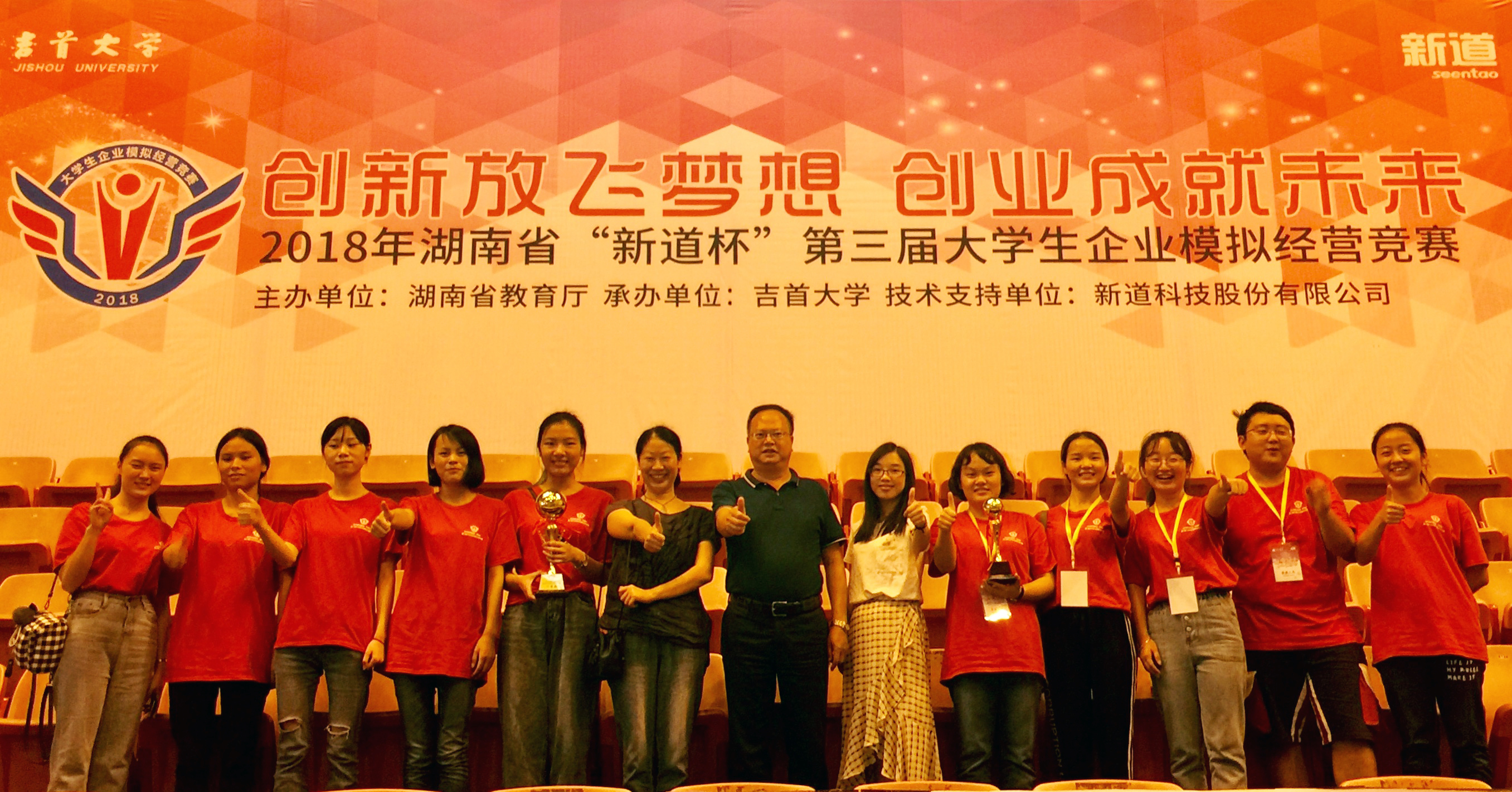 本网讯 9月16日,由湖南省教育厅主办,吉首大学承办的2018年湖南省“新道杯”第三届大学生企业模拟经营竞赛在吉首大学体育馆落下帷幕。来自省内40所本科院校80支队伍参加了此次竞赛。我校由经管学院李清泉院长带队参赛,盘娟梅和罗婷两位老师指导的两支代表队,经过2天的激烈角逐,分别获得一等奖和三等奖的佳绩。