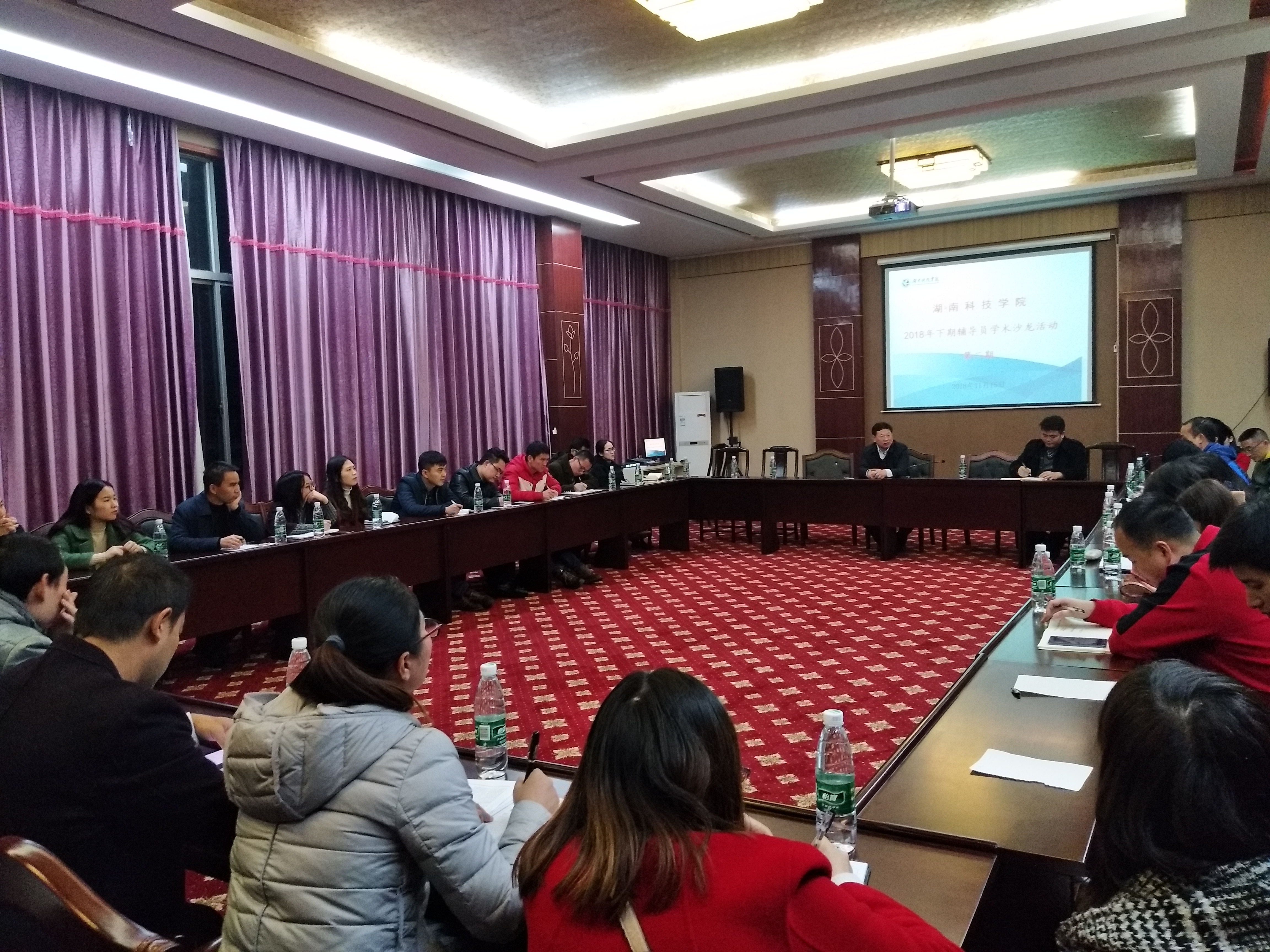 本网讯(罗晶奉苏妹)11月15日晚7点,天行平台_天行(中国)2018年第二期辅导员学术沙龙活动在行政楼八楼三会议室举行。各院党总支副书记、全体辅导员和学工部相关人员参加了本次活动。活动由学工部副部长胡敏辉主持,学工部长唐华山出席。