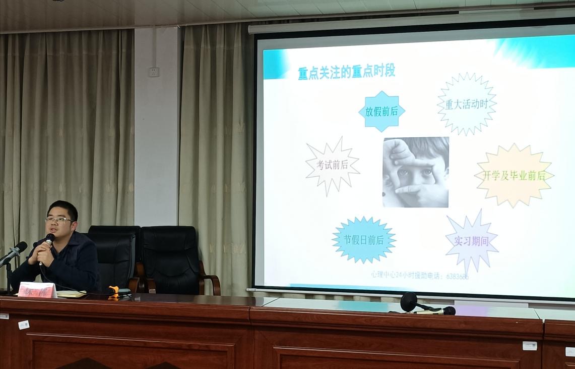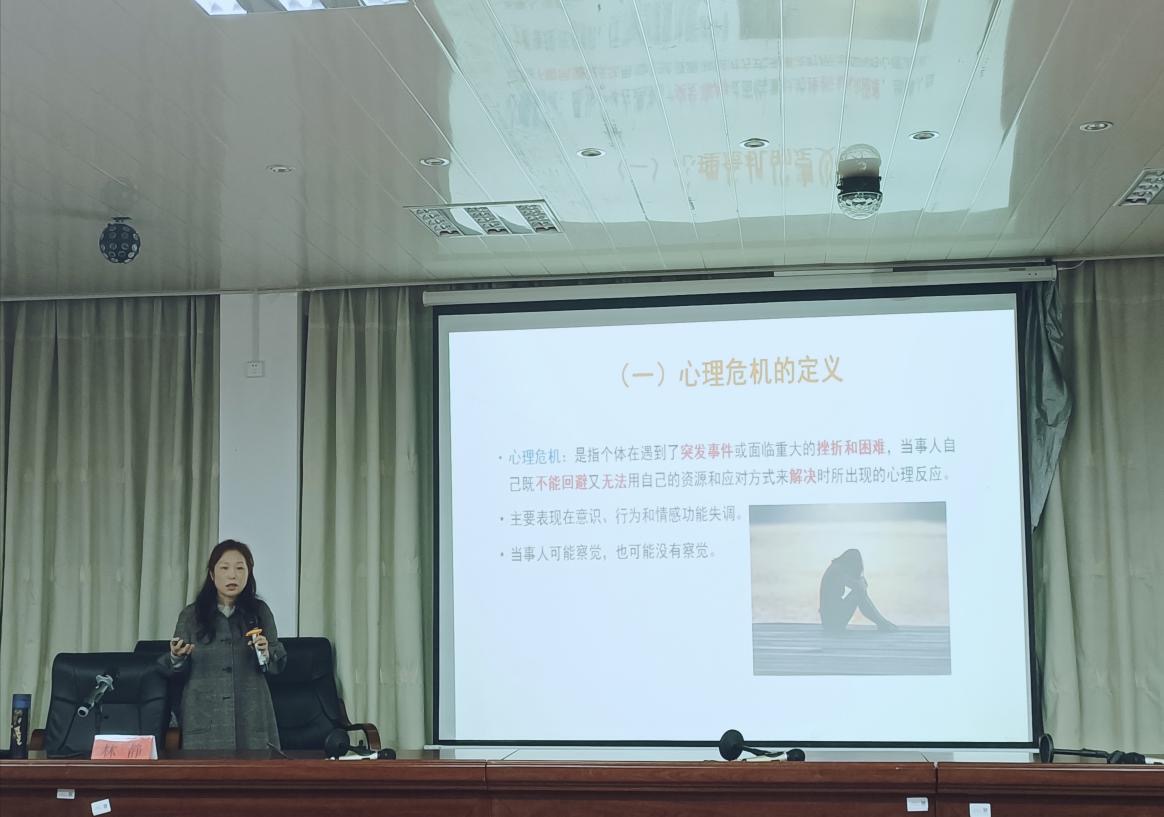 培训分为两个专题。专题一《大学生心理危机信息识别》由心理学教授林静主讲。专题二《大学生心理危机信息上报和处置》由校心理中心专职咨询师涂巍主讲。培训结束后,对所有参培人员进行了现场测试。