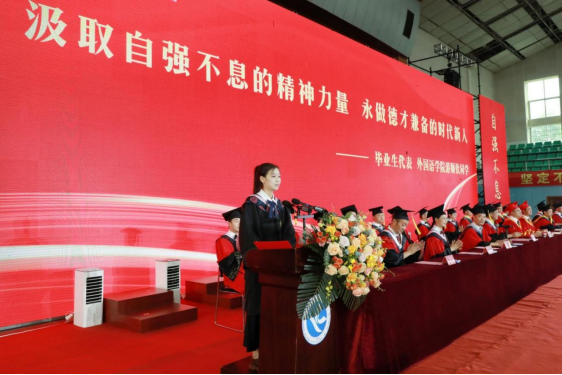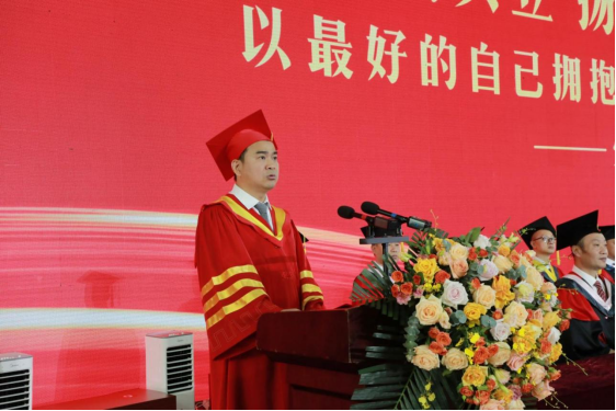 2024届毕业生、英语2005班游顺钦同学代表全体毕业生向学校、老师、家人和朋友们致以最崇高的敬意和最深切的感激。她呼吁全体毕业生要不断用汗水去书写无限可能的青春。