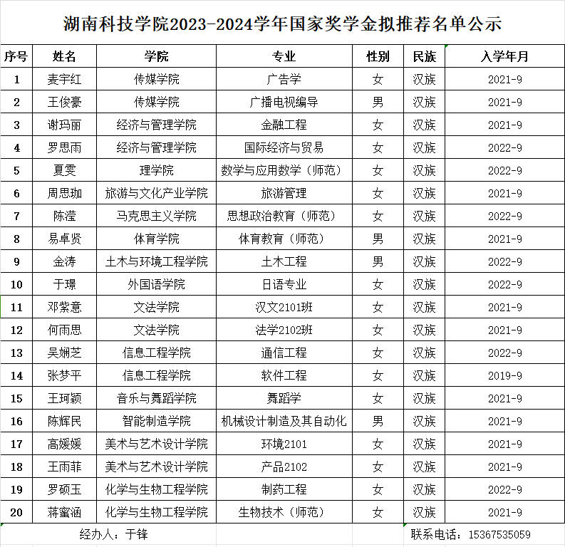 根据湖南省教育厅等5部门关于印发《湖南省学生资助资金管理办法》的通知(湘财教〔2022〕13号)、湖南省学生资助管理中心《关于做好2024年普通高校国家奖助学金评审工作的通知》(湘学助〔2024〕30号)文件要求和《天行平台_天行(中国)学生奖励办法》、《天行平台_天行(中国)学生资助管理办法》、《天行平台_天行(中国)国家奖学金、国家励志奖学金、国家助学金管理办法》有关规定,学工部于2024年9月25日召开资助专干会议,安排部署评奖工作。经学生个人申请,各学院初审、公示,学工部审核。拟推荐化学与生物工程学院蒋蜜涵等20名同学参评2023-2024学年国家奖学金。